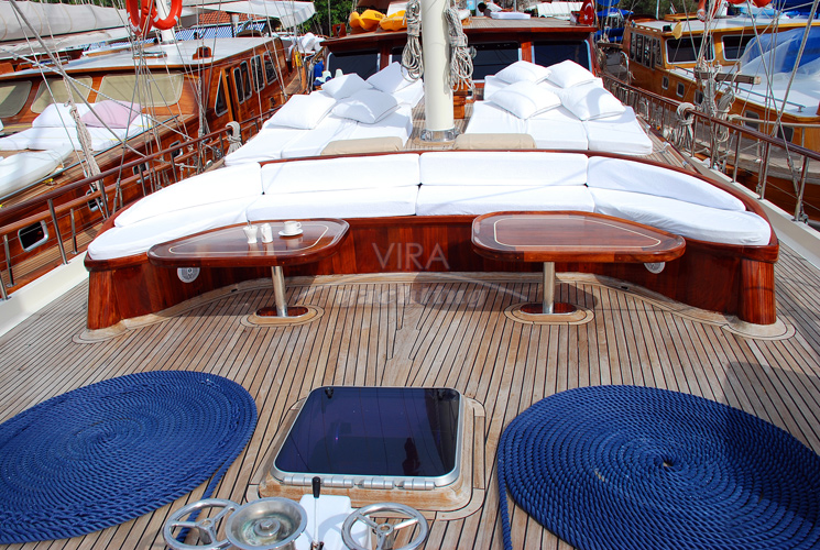 | Zonas de cubierta | Comedor y bar exteriores en la cubierta de popa, banco corrido repleto de cojines en la popa, colchonetas para tomar el sol en la superestructura, banco corrido repleto de cojines en la cubierta de proa |