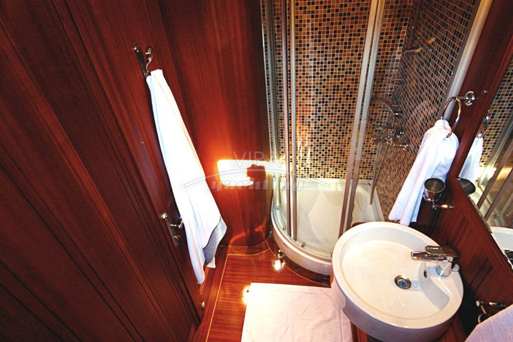 | Alojamiento | • Para hasta 12 personas en 6 camarotes (con baños independientes) 1 camarote master de popa (dispuesto al ancho entero) con cama king size y sofá 1 camarote master de proa (dispuesto al ancho entero) con cama king size y sofá 2 camarotes con cama matrimonial 2 camarotes con 2 camas individuales cada uno Baños con lavabo, cabina de ducha y W.C. con bomba de vacío eléctrica (los camarotes master disponen de 2 cuartos de baño cada uno, uno con cabina de ducha y otra con WC) • Salón con comedor interior y barra de bar • Camarotes separados de la tripulación |