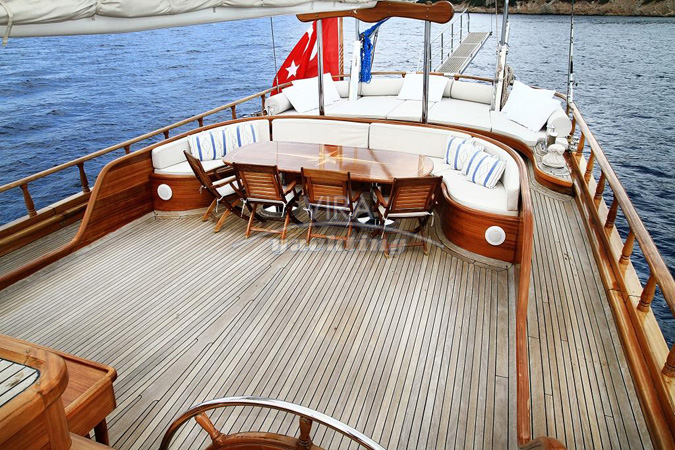 Una goleta de superlujo de Bodrum, elegante y de aspecto impresionante, uno de los más hermosos ejemplos de las goletas turcas, cumpliendo las más altas exigencias de calidad. Ofrece un equipamiento técnico de más alto nivel, unas buenas prestaciones de navegación a vela, espaciosos camarotes en caoba, bien diseñados y suntuosamente decorados, así como zonas de cubierta amplias y elegantes con hermoso servicio de mesa y accesorios decorativos. La tripulación ofrece un servicio de primera clase, el cocinero es uno de los mejores en todas las goletas turcas. En resumen, es la embarcación perfecta para los clientes VIP más exigentes deseando alquilar una goleta de superlujo para unas vacaciones en un ambiente exclusivo y completa privacidad en las costas de Turquía.